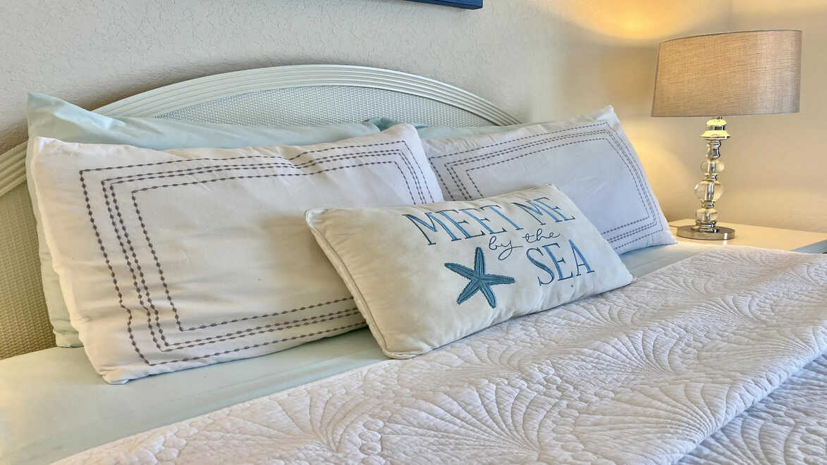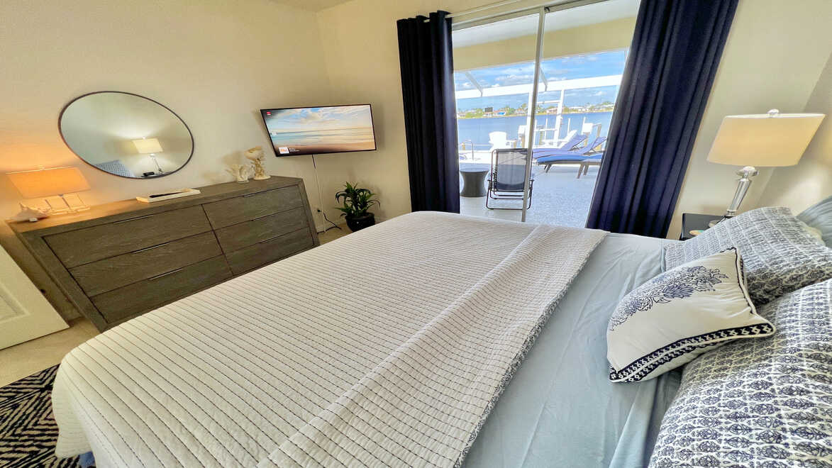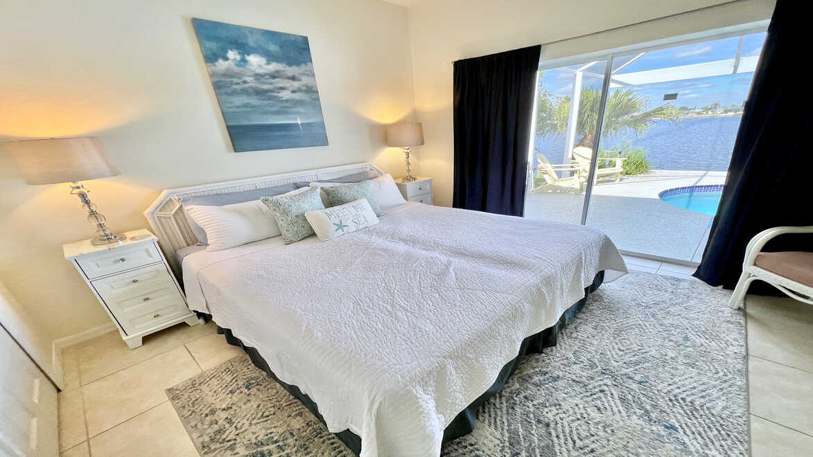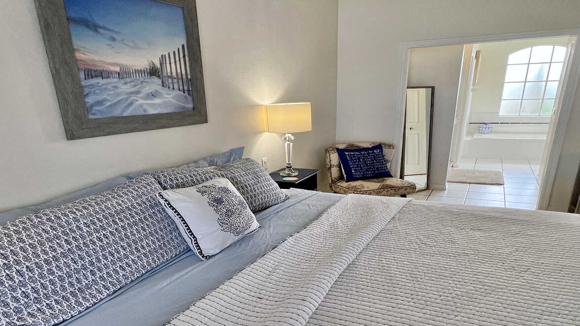 Das in blau und weiß gehaltene Hauptschlafzimmer empfängt Sie mit einem übergroßen Doppelbett Das in blau und weiß gehaltene Hauptschlafzimmer empfängt Sie mit einem übergroßen Doppelbett - Traum-Urlaub-Florida